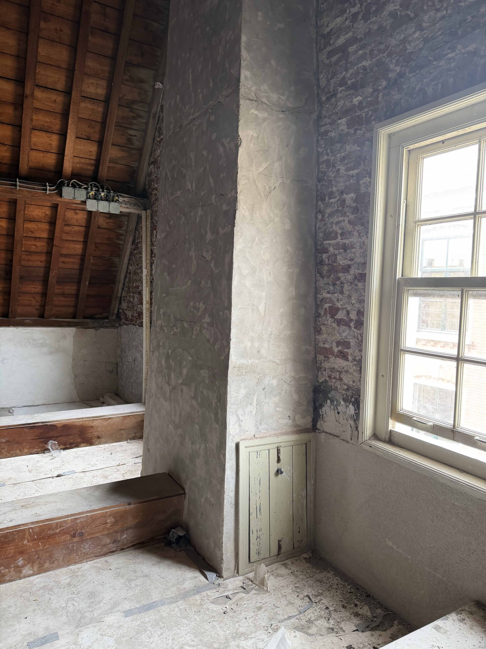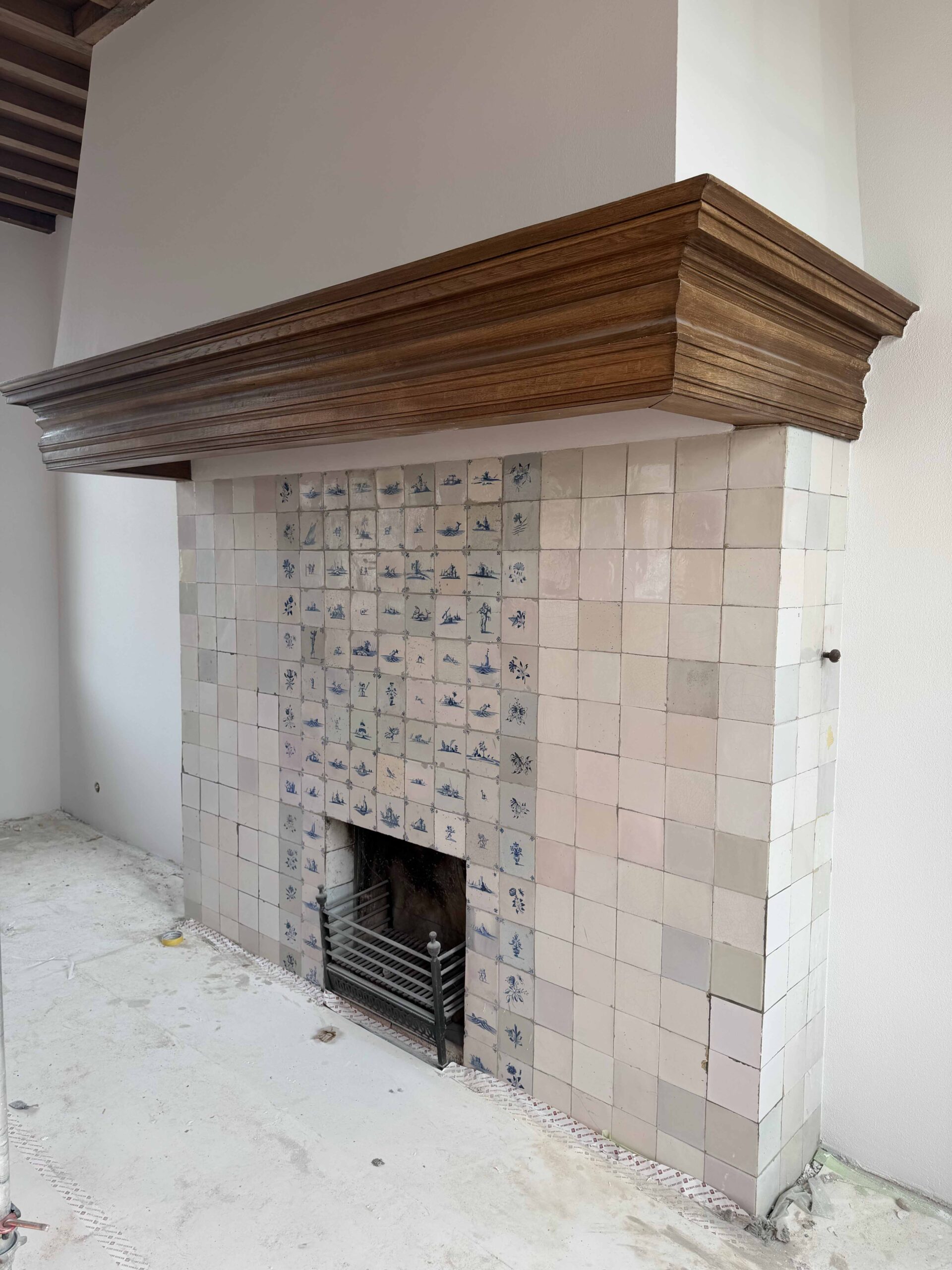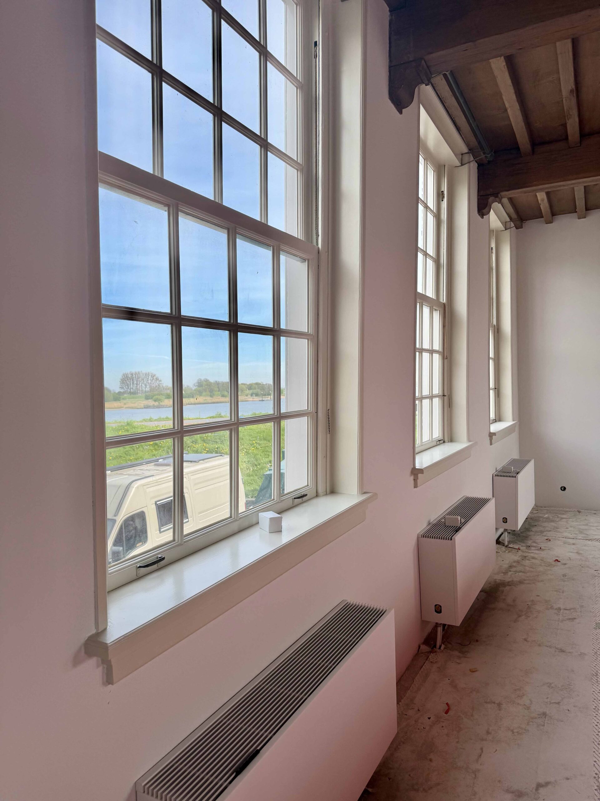 Het volledige stuc- en schilderwerk van het Raadhuis wordt door ons met grote zorg hersteld. Het bestaande stucwerk is eerst volledig verwijderd en daarna opnieuw aangebracht. Om tot de juiste materiaalkeuze te komen, hebben we diverse onderzoeken uitgevoerd naar het meest geschikte stucmateriaal voor dit gebouw. Beschadigde tegels op de schouw zijn vervangen en ook de verouderde radiatoren zijn vernieuwd. Om UV-schade aan het interieur te beperken en extra comfort toe te voegen, plaatsen we bovendien achterzetbeglazing achter de monumentale ramen. Zo wordt het Raadhuis weer langzaam opgeknapt, zonder dat de monumentale waarde verloren gaat.