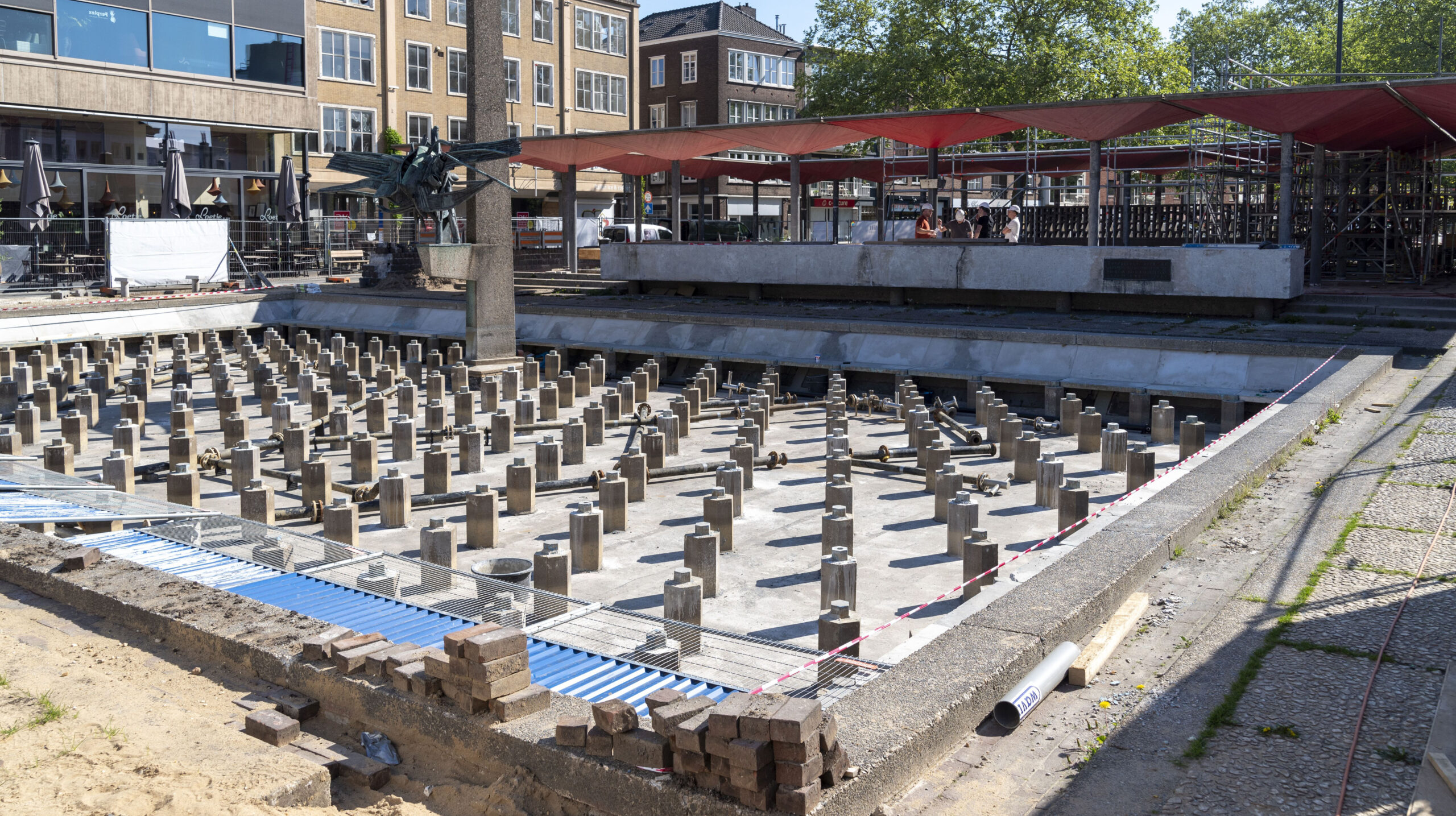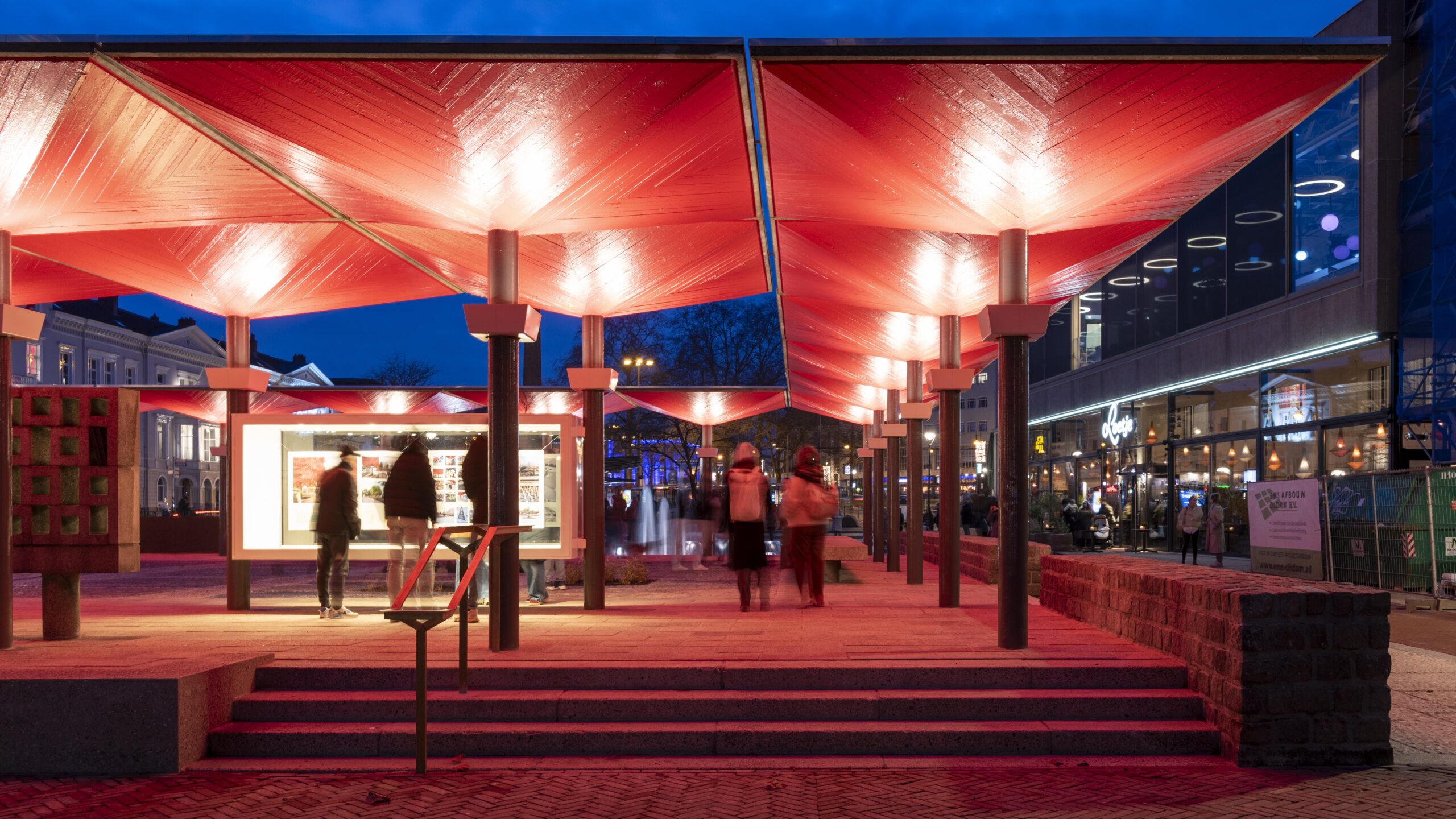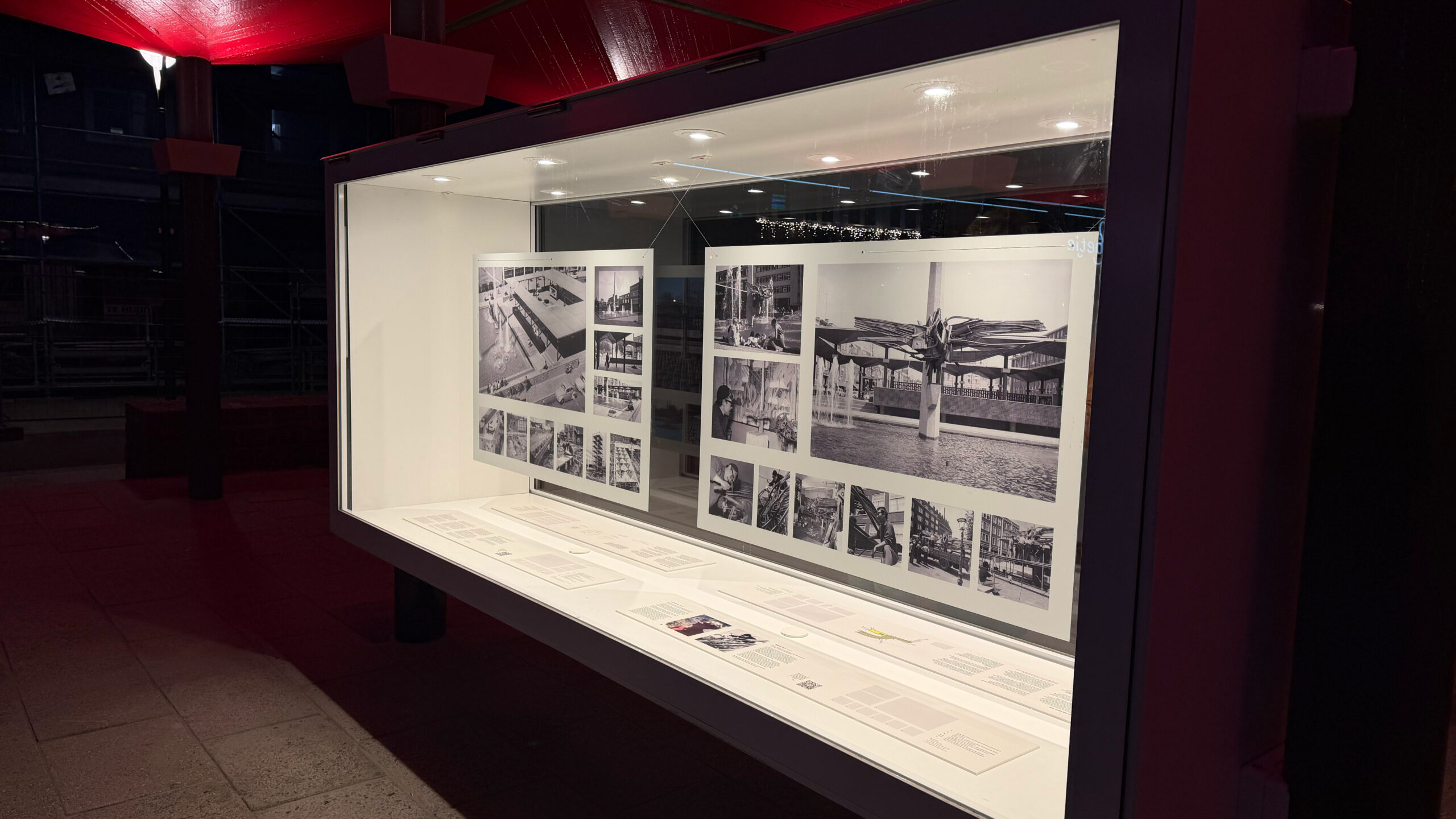 De verlichte vitrines vertellen de geschiedenis van de AKU-fontein en laten tijdelijk het verloop van de restauratie zien. Hierdoor krijgen de bezoekers inzicht in zowel het monument als het ambachtelijke restauratieproces.